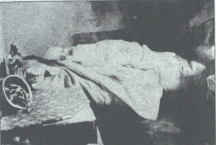 Cause of death: Neurogenic shock induced by extensive burns; unconsciousness within one minute, death within three to five minutes of ignition.